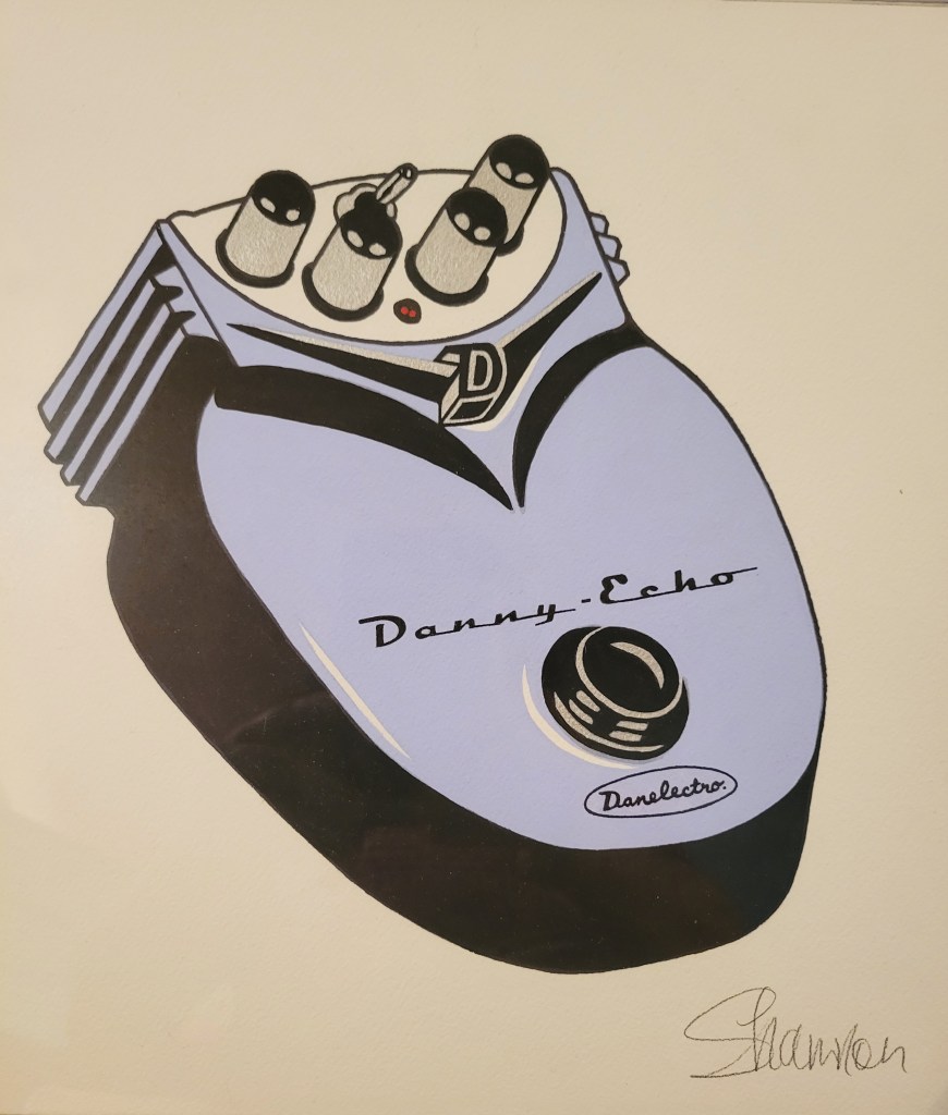 The art work is by Vancouver artist/musician (Actors, Leathers) Shannon Hemmett. During the early days of covid she was making her rent doing a series of pop art paintings of guitar pedals with famous bands names on them. I commissioned her to paint my Danelectro delay pedal called the “Dan-Echo” which is where I got my stage name. It hangs in my studio and always reminds me of where and why I started making music. Enjoy!!