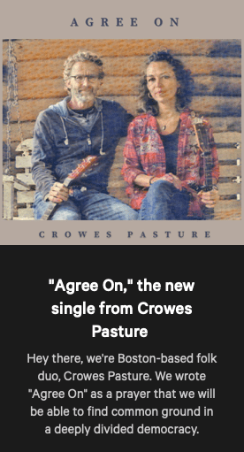 Today’s tea + soundtrack + visuals is curated by Crowes Pasture. Folk duo, Crowes Pasture, have penned a new song which addresses finding commonalities within American society. The Bostonians’ touring has led them to tour up and down the East Coast, granting them insights into the political perspectives of a wide array of individuals.The plaintive and acoustic “Agree On” is what the duo considers to be a “prayer that we will be able to find common ground in a deeply divided democracy.” “We are struck by how much people actually have in common as parents, children, workers, Americans, brothers and sisters. For this country to move forward in a positive way, we need to acknowledge and respect differences, but we also need to appreciate the humanity that exists in everyone.”